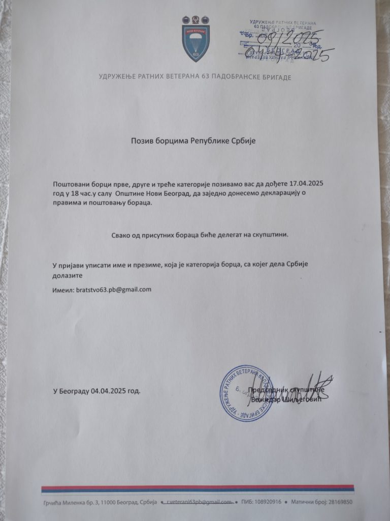 Дана 17.04.2025.год. у сали Општине Нови Београд у 18 часова, Удружење ратних ветерана 63.падобранске бригаде позива борце Републике Србије I, II и III да заједно донесемо Декларацију о правима и поштовању бораца.